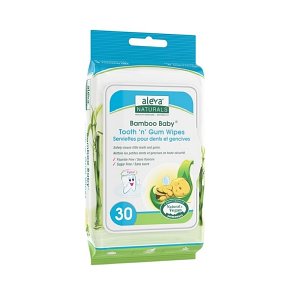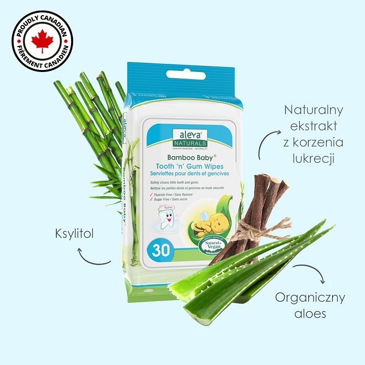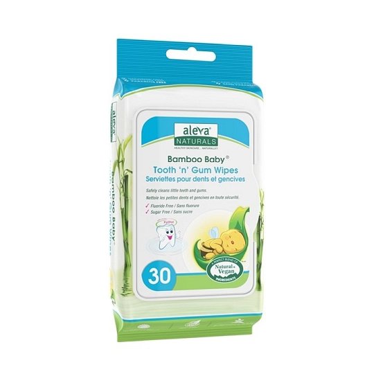 Ważne jest, aby od urodzenia wprowadzać dobry nawyk higieny jamy ustnej. Nawet jeśli dziecko nie ma jeszcze ząbków, ważne jest, aby oczyścić jamę ustną po wypiciu mleka lub soku. Aleva Naturals opracowała specjalnie dla tego celu chusteczki do czyszczenia ząbków i dziąseł! Bambusowe chusteczki posiadają specjalną teksturę ułatwiającą owinięcie ich wokół palców i czyszczenie małych ząbków i dziąseł dziecka. Formuła zawierająca czyste w 100% roślinne składniki i ksylitol dla dodatkowej ochrony i jaśniejszego uśmiechu. Przyjazne dla środowiska ulegają biodegradacji w ciągu 28 dni! Chusteczki bambusowe nie są i nie muszą być wybielane, ponieważ zawierają naturalny środek antybakteryjny zawarty we włóknie bambusowym. Praktyczne, wygodne opakowanie sprawia, że długo zachowują swoje właściwości. Idealne do użycia w podróży!