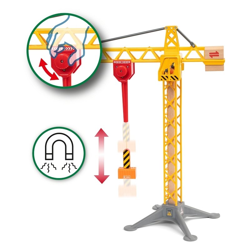 Mający prawie pół metra wysokości dźwig jest gotowy do podjęcia wszelkich wyzwań budowlanych w świecie BRIO. Zarządzanie ładunkami i konstrukcjami nigdy nie było tak zabawne, jak w przypadku tego w pełni funkcjonalnego dźwigu wyposażonego w obrotową o 360 stopni wieżę, wózek roboczy i hak magnetyczny. Wszyscy z pewnością zauważą jak zapalają się światła, a operator rozpoczyna pracę z wygodnej kabiny.