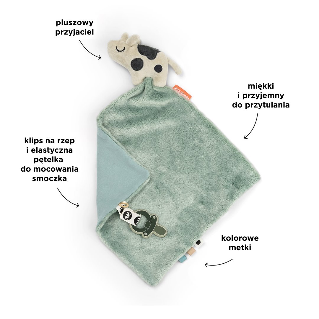 Mięciutki kocyk ze świnką, metkami oraz zawieszką na smoczek. Przytulny kocyk został zaprojektowany tak, aby koić i stymulować zmysły Twojego dziecka. Dzięki połączeniu różnych faktur i kolorowych metek zachęca małe rączki do eksploracji i odkrywania. Miękki i wygodny, idealnie nadaje się do przytulania podczas pierwszych samodzielnych chwil na świecie.
