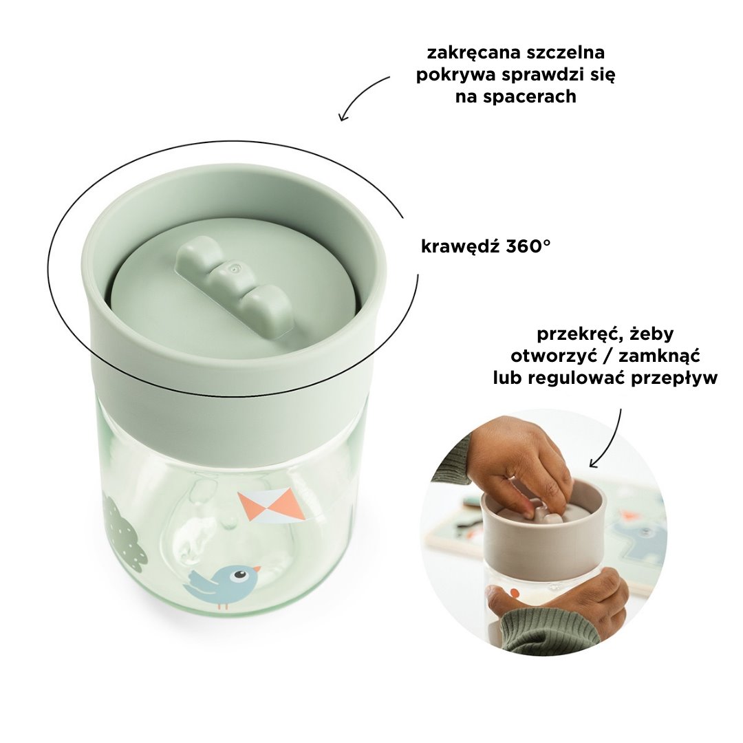 Dzięki innowacyjnej krawędzi do picia 360° dziecko może pić z dowolnej strony kubka – tak jak z tradycyjnego kubka, ale w bezpieczniejszej, treningowej wersji. Szczelna konstrukcja zapobiega wylewaniu napoju, a mechanizm „twist to open/close” pozwala łatwo otwierać i zamykać kubek oraz regulować przepływ płynu.