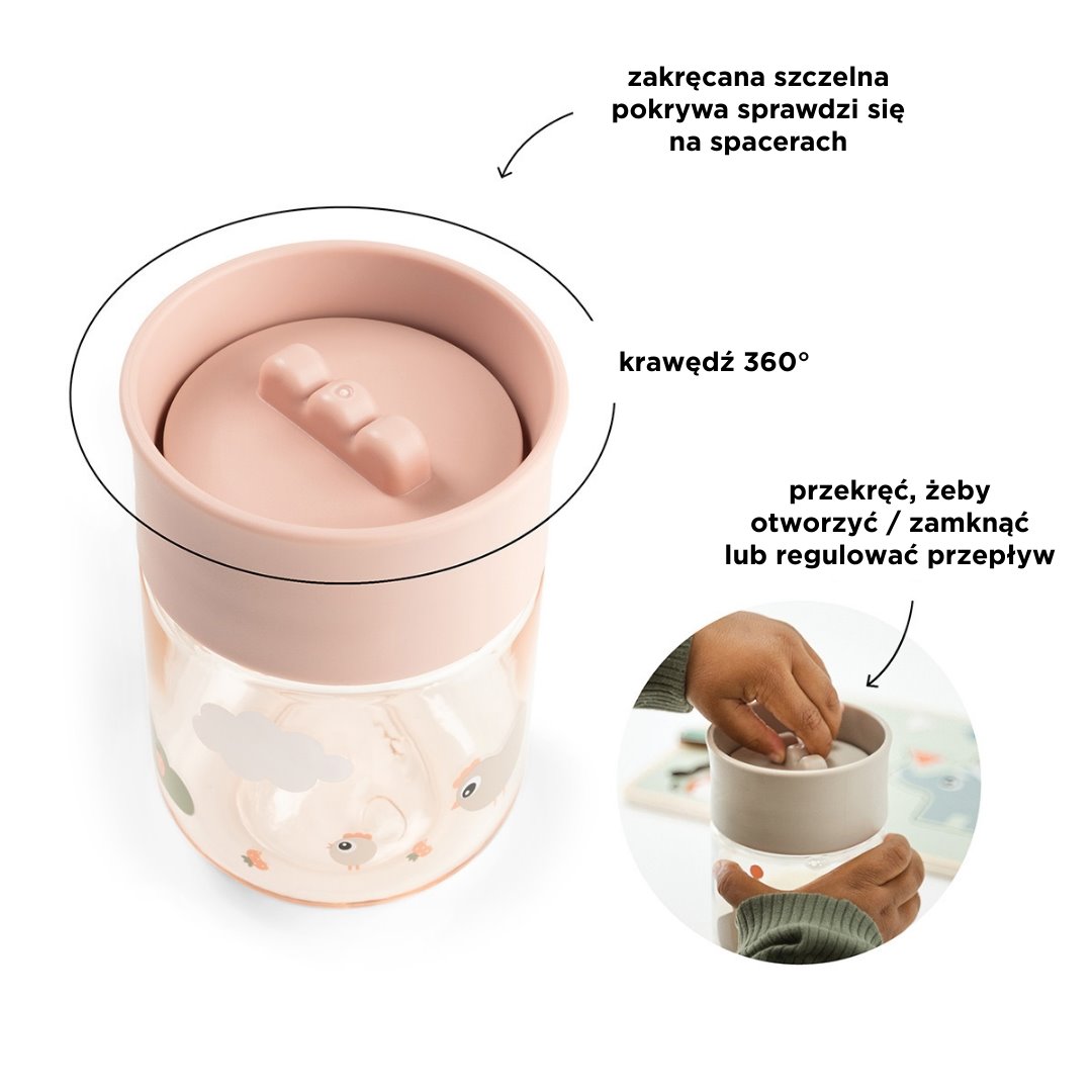 Dzięki innowacyjnej krawędzi do picia 360° dziecko może pić z dowolnej strony kubka – tak jak z tradycyjnego kubka, ale w bezpieczniejszej, treningowej wersji. Szczelna konstrukcja zapobiega wylewaniu napoju, a mechanizm „twist to open/close” pozwala łatwo otwierać i zamykać kubek oraz regulować przepływ płynu.