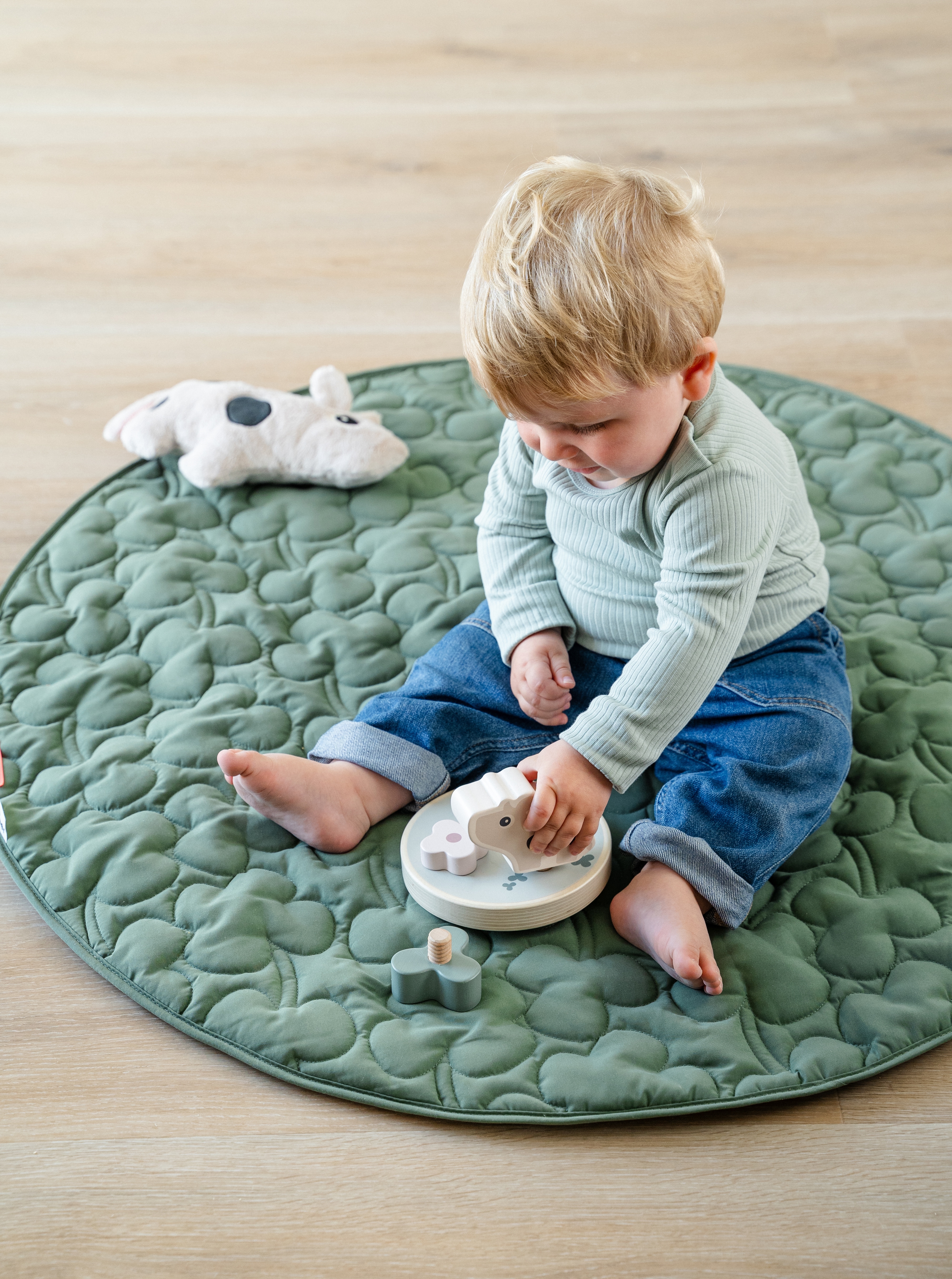 Cztery wiszące zabawki można dostosować do etapu rozwoju dziecka a także odłączyć, aby umożliwić samodzielną zabawę. Miękka pikowana mata, ozdobiona uroczym wzorem koniczyny, zapewnia przytulną i mięciutką przestrzeń do zabawy.