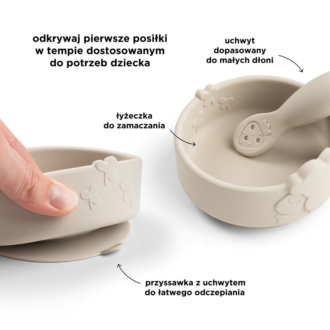 Silikonowa miseczka z przyssawką i łyżeczka do zanurzania (maczania) to akcesoria zaprojektowane z myślą o małych dziecięcych rączkach, które doskonale sprawdzą się na pierwszym etapie rozszerzania diety dziecka. Stworzono je z myślą o nauce samodzielnego jedzenia.