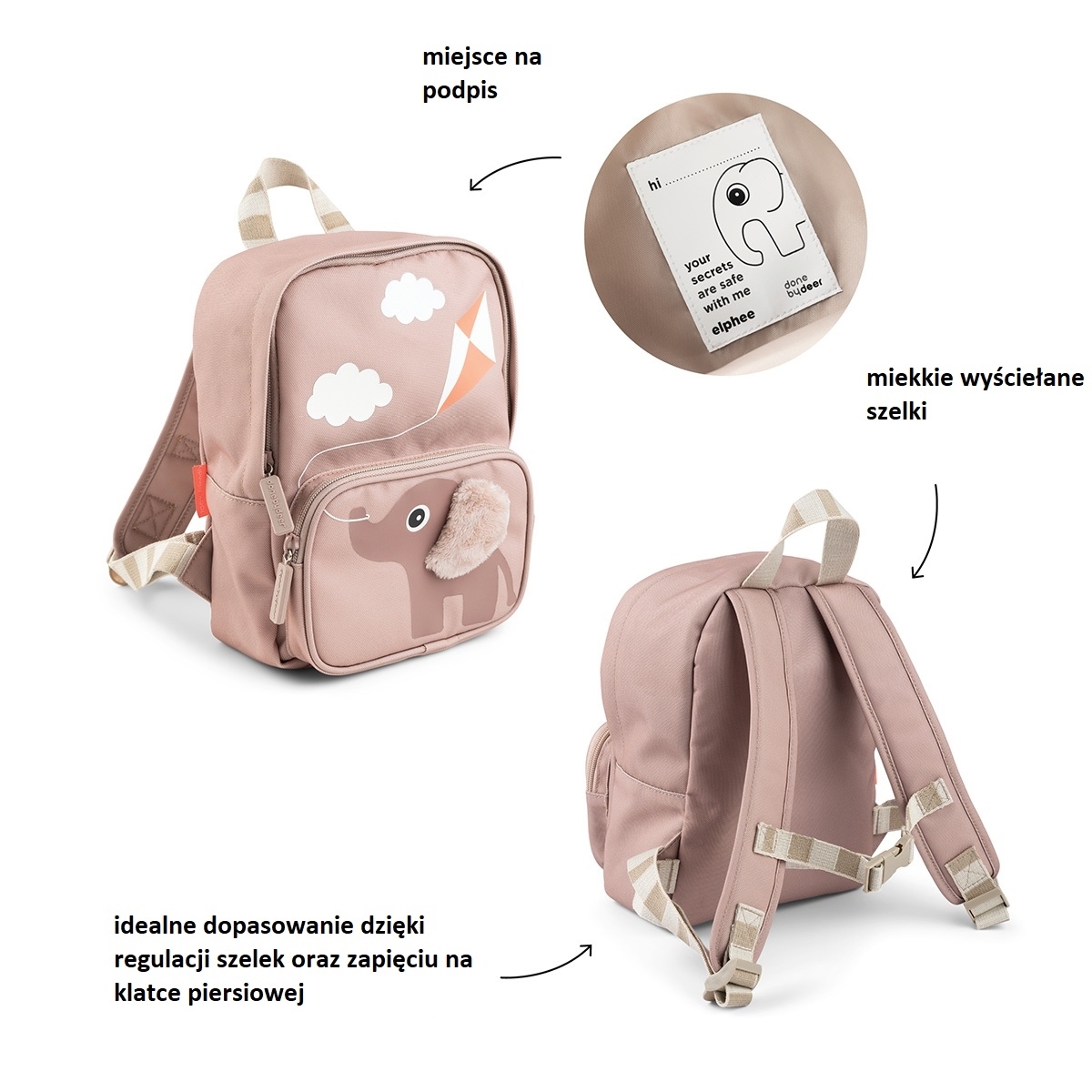 Ten uroczy plecak dla dziecka zaprojektowany jest tak aby idealnie dopasować się do Twojego malucha. Posiada regulowane miękkie szelki oraz odpinany pasek na mostek. Przestronna komora główna jest idealna do noszenia lunchboxa i bidonu, a przednia kieszeń jest świetnie sprawdzi się na drobiazgi i różne skarby. Słonik Elphee będzie mieć oko na rzeczy Twojego dziecka dzięki możliwości podpisania na uroczej etykiecie w środku.