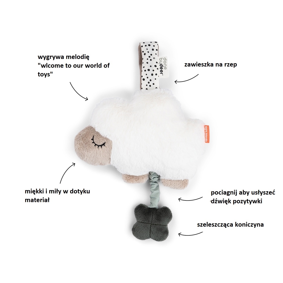Ta urocza zabawka muzyczna to idealny sposób na uspokojenie ale także pierwszą zabawę Twojego malucha. Pociągnij za szeleszczącą koniczynkę i ciesz się uspokajającą melodią „Welcome to our world of toys”.