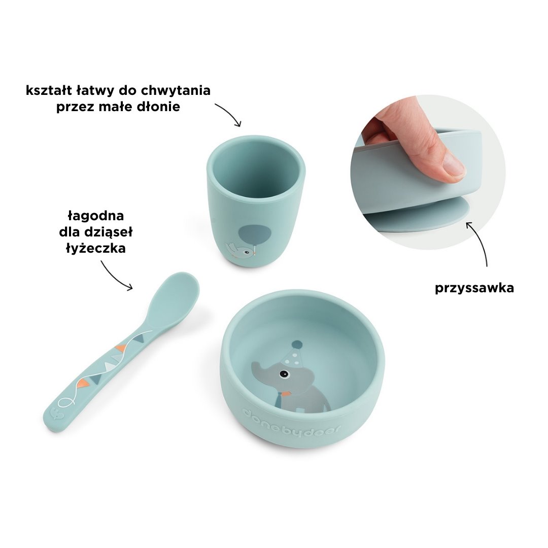 Silikonowy zestaw obiadowy idealny do podawania pierwszych posiłków. Praktyczny, antypoślizgowy zestaw obiadowy dla dziecka składa się z miseczki z przyssawką, kubka i łyżeczki. Silikonowy zestaw obiadowy jest odporny na upadki - to znakomita alternatywa dla plastikowych naczyń, które łatwo ulegają uszkodzeniom. Zestaw został wykonany w 100% z silikonu.