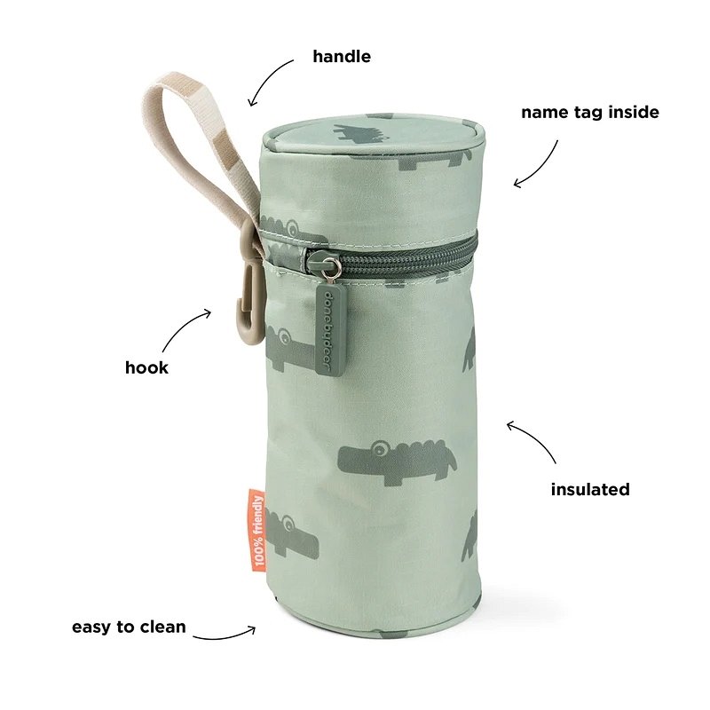 Torbę termiczną na butelkę można łatwo przenosić za pomocą paska lub zawiesić ją na termicznej torbie śniadaniowej Done by Deer. Górę łatwo jest otworzyć za pomocą suwaka. Gdy ją uchylisz, Croco obieca, że się tobą zaopiekuje z umieszczonej wewnątrz plakietki z imieniem.