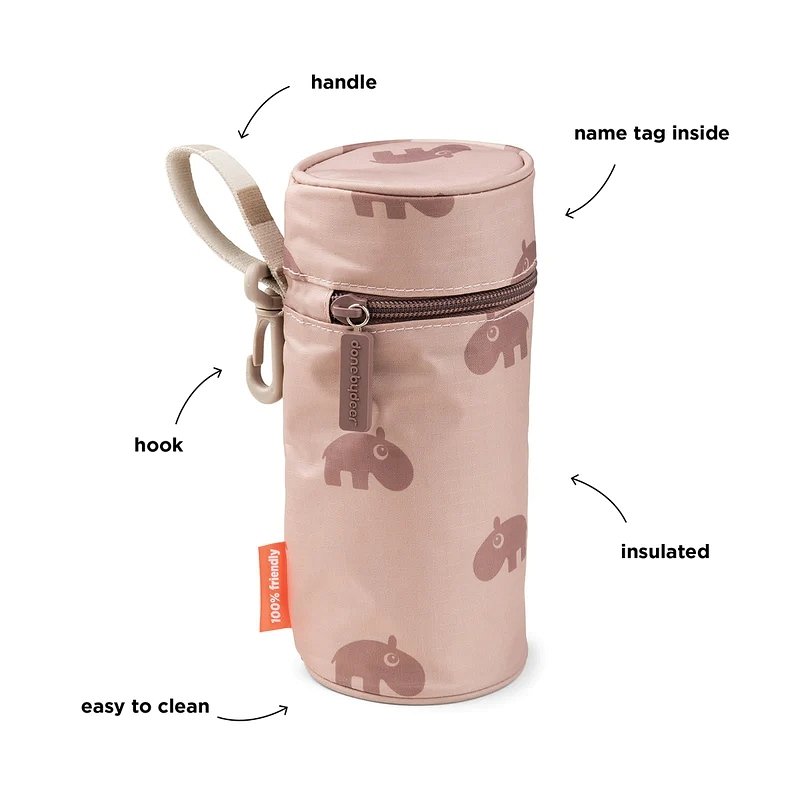 Termoopakowanie na butelkę Done by Deer jest ozdobione sympatycznym hipopotamem Ozzo. Wykonano je w 100% z poliestru, który jest trwały i odporny na warunki pogodowe, a także łatwy do czyszczenia wilgotną ściereczką. Pasek posiada charakterystyczne dla Done by Deer paseczki ozdobne w ładnym piaskowym kolorze.