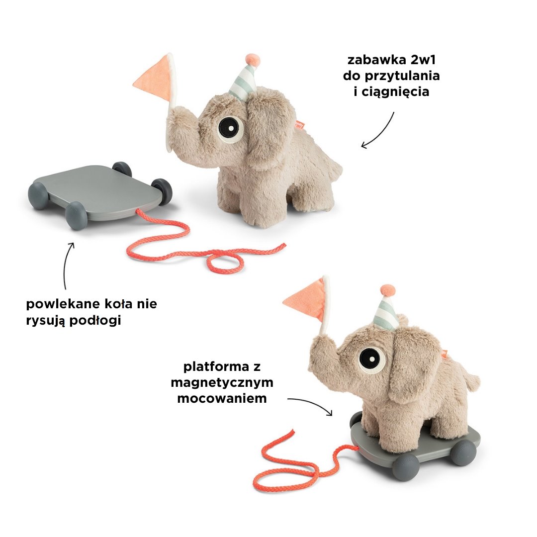 Zabawka do ciągnięcia od Done by Deer to uroczy słonik z platformą na kółkach, która podąża za dzieckiem motywując je do nauki chodzenia. Wystarczy, że odczepisz maskotkę od platformy, do której przytwierdzona jest magnetycznymi nóżkami, a zamieni się w ulubionego pluszaka. Przytulanka wykonana z miękkiego i delikatnego materiału doskonale sprawdzi się do tulenia i zabawy.