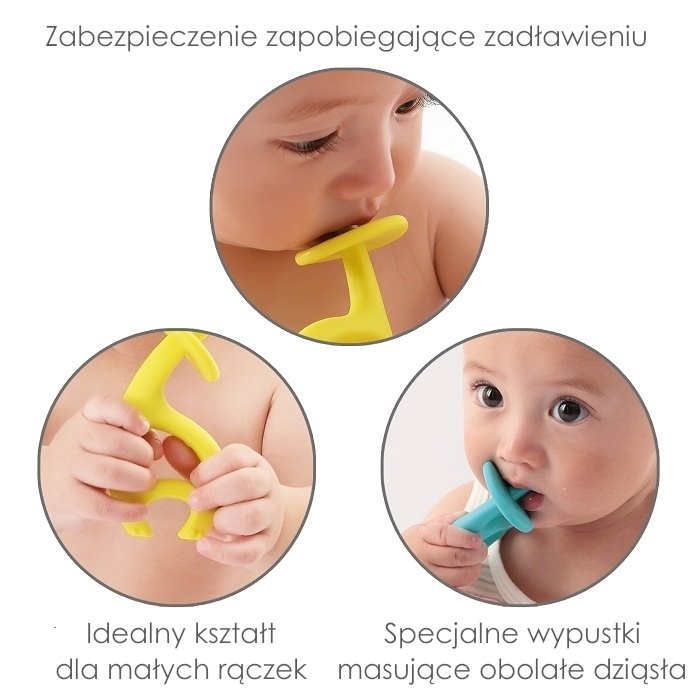 Miękki gryzak silikonowy z delikatnymi wypustkami pomaga łagodzić ból podczas ząbkowania, a ergonomiczny kształt ułatwia maluchowi samodzielne chwytanie i wkładanie gryzaka do buzi.