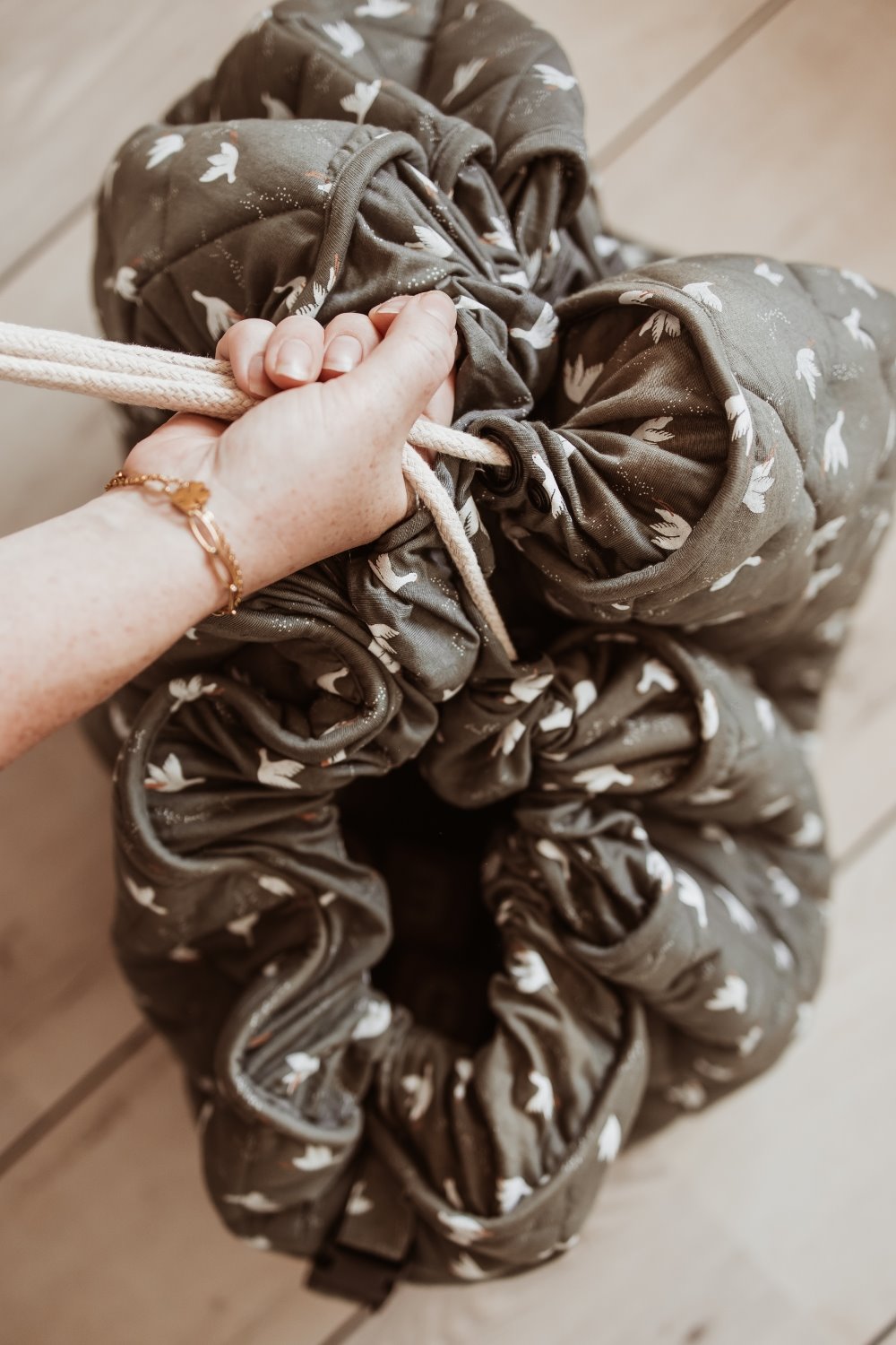 Worek do przechowywania zabawek: Super-łatwy, wygodny i szybki sposób na osiągnięcie porządku w pokoju dziecięcym. Mata do zabawy w kilka sekund zamienia się w elegancki i stylowy worek na zabawki, dzięki któremu błyskawicznie pożegnasz się z bałaganem, a dziecięce zabawki znajdą dla siebie naprawdę przytulne miejsce.
