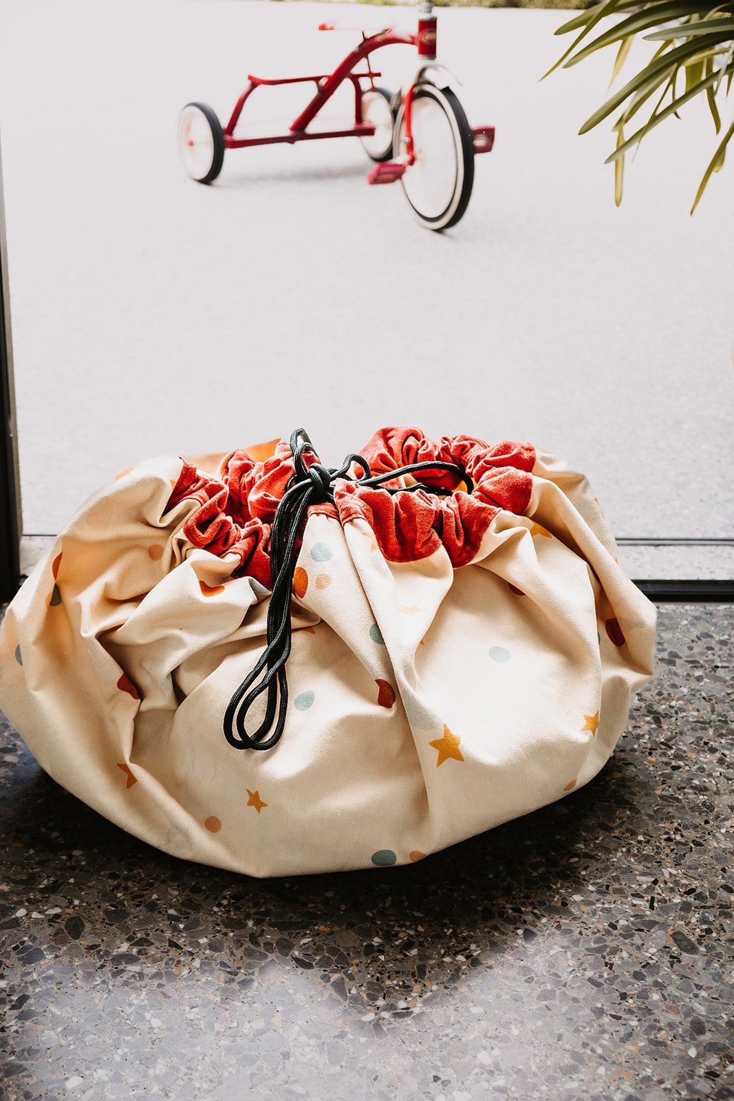 Dwustronna mata do zabawy, którą w kilka sekund zamienisz w worek na zabawki. Wygodne rozwiązanie do zabawy i przechowywania z pięknym nowoczesnym wzorem.