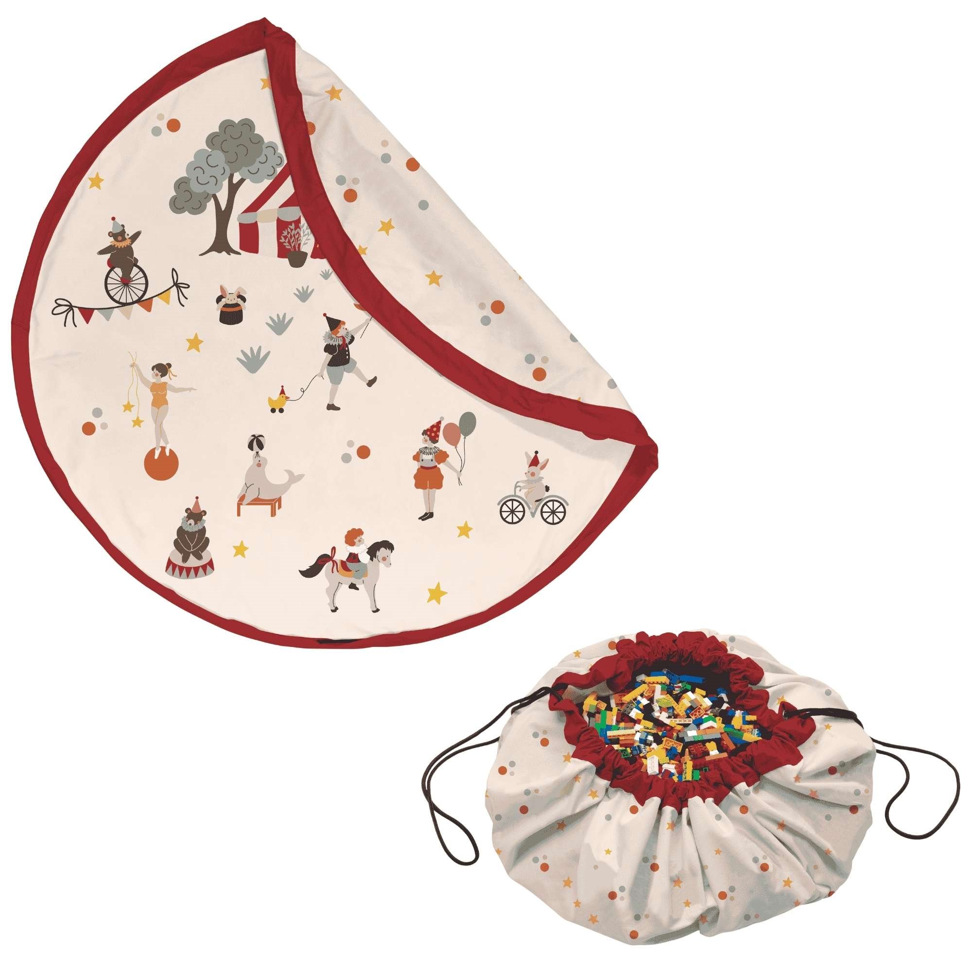 Wkrocz do świata magicznych sztuczek z matą do zabawy Circus, którą łatwo przekształcisz w worek do przechowywania zabawek. Umieść substytut cyrkowego namiotu w dziecięcym pokoju i pozwól maluchowi na kreatywną zabawę, a gdy ta dobiegnie końca – pociągnij za sznurki i zamknij cyrk wraz z zabawkami malucha, aż do czasu następnego przedstawienia.