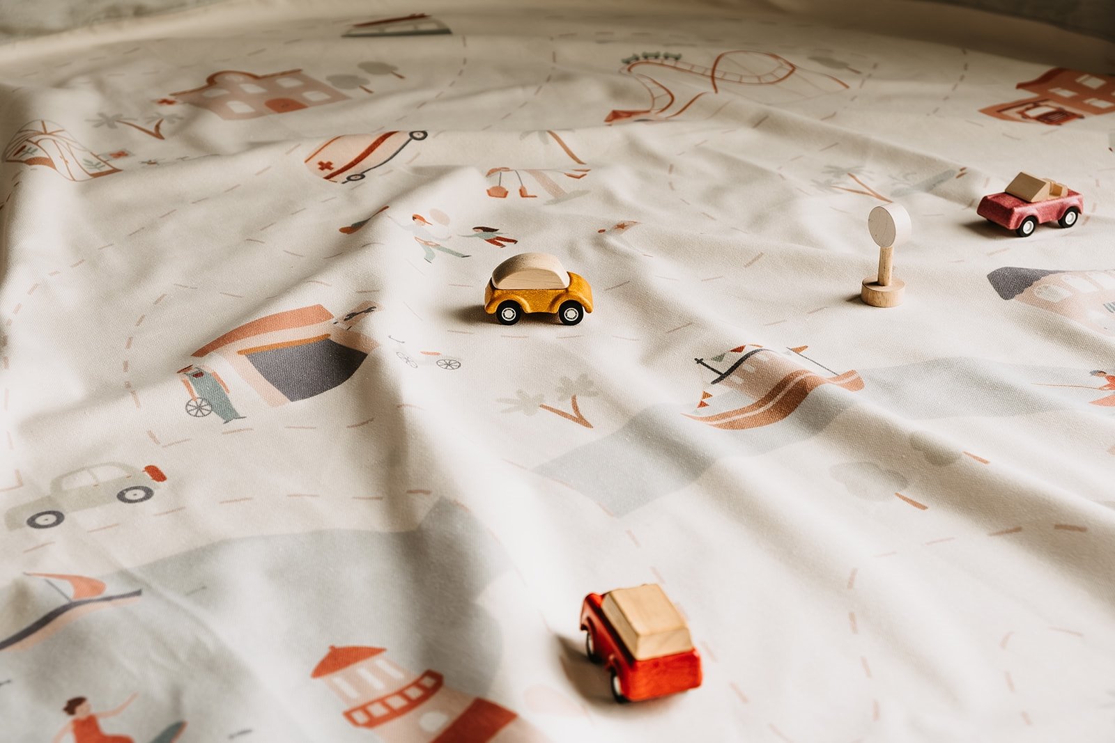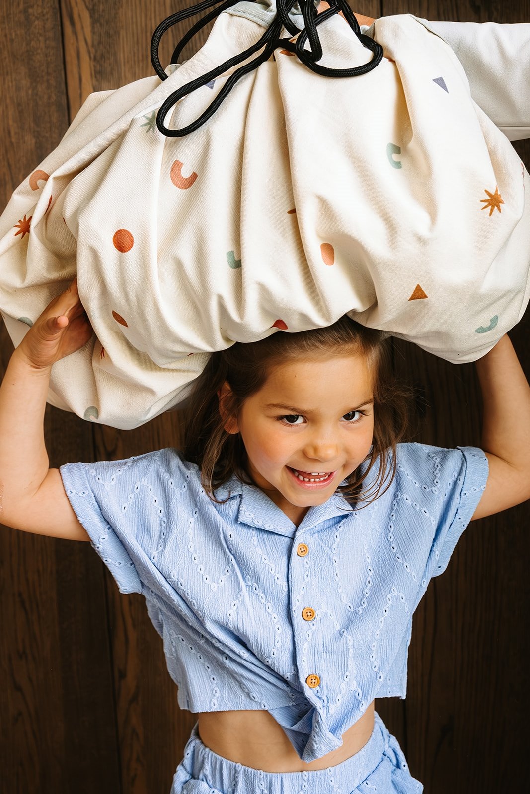Dwustronna mata do zabawy, którą w kilka sekund zamienisz w worek na zabawki. Wygodne rozwiązanie do zabawy i przechowywania z pięknym nowoczesnym wzorem.