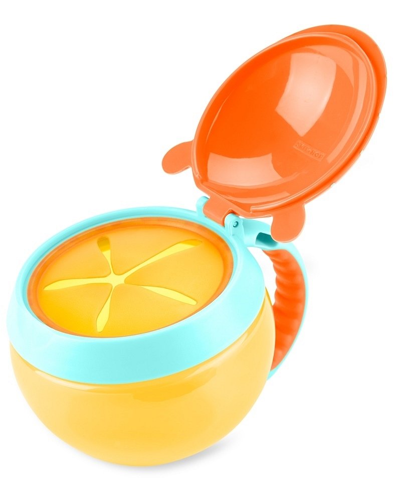 Wygodny uchwyt pojemnika na przekąski dostosowany jest do małych rączek, a górna pokrywa z zatrzaskiem gwarantuje, że żywność pozostanie świeża. Elastyczny otwór wewnętrzny zapobiega wysypywaniu się przekąsek – nawet jeśli odwrócisz kubek do góry nogami. Dzięki dwóm pokrywkom jest mniej bałaganu, a w torbie rodzica nie ma okruszków!