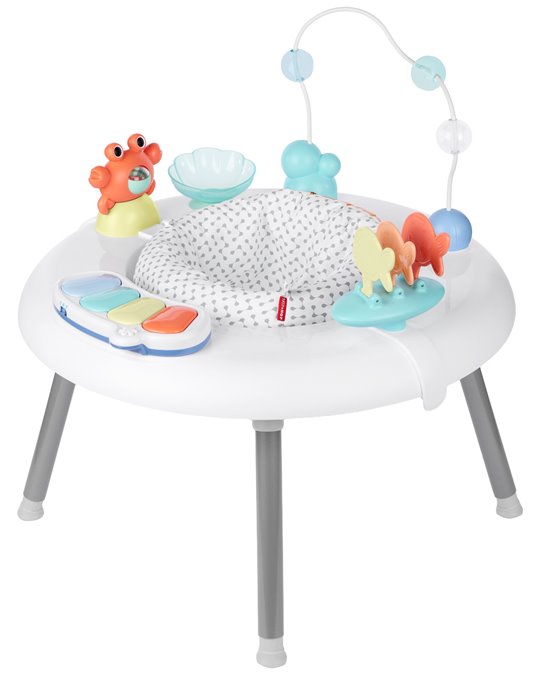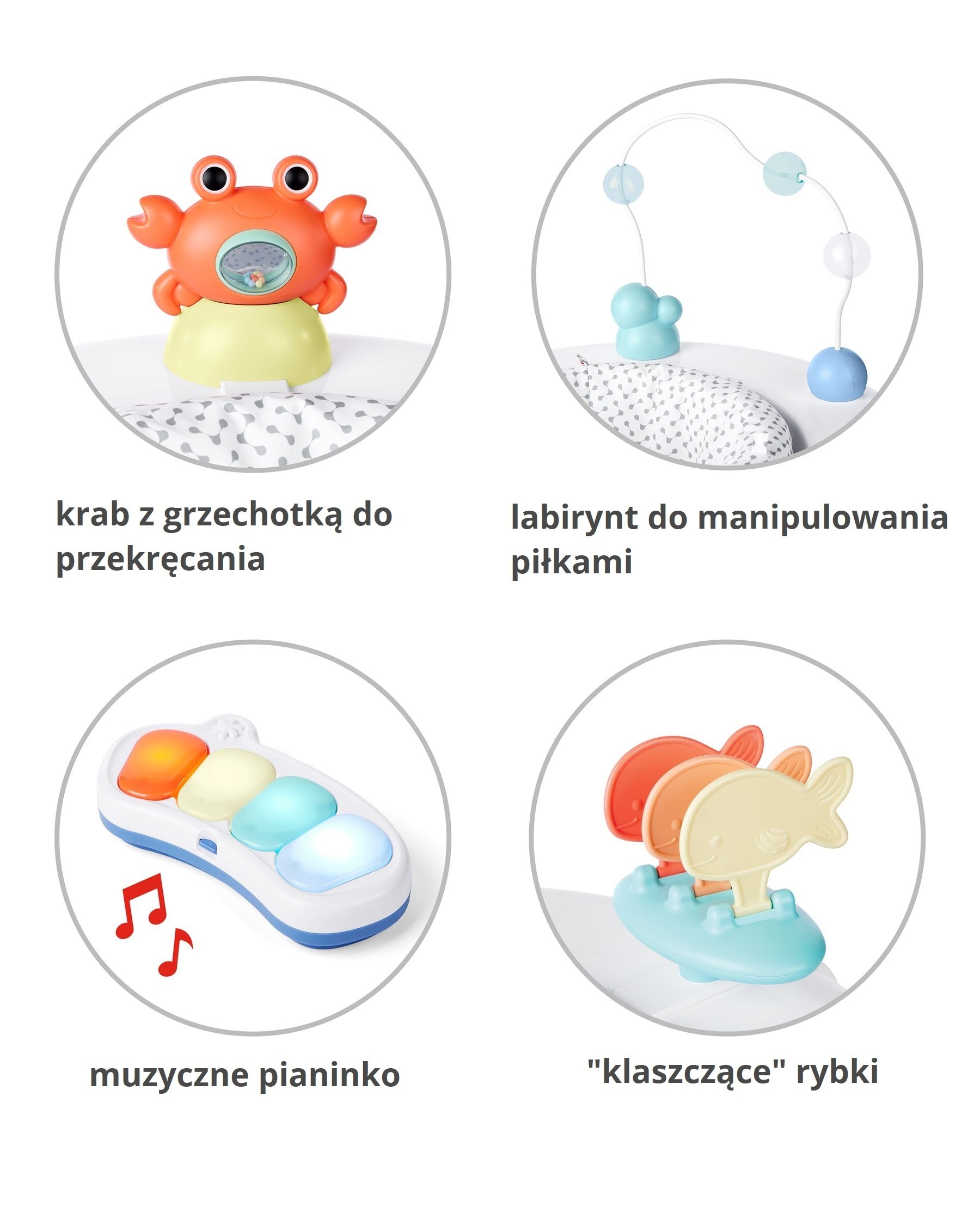 Centrum posiada 4 poziomy regulacji wysokości, a ruchome zabawki - grzechotka krab, „klaszczące” rybki i przesuwane koraliki - zachęcają dziecko do odkrywania i aktywnej zabawy.