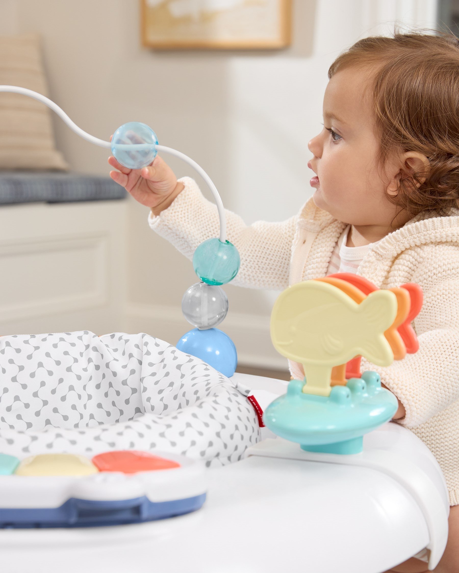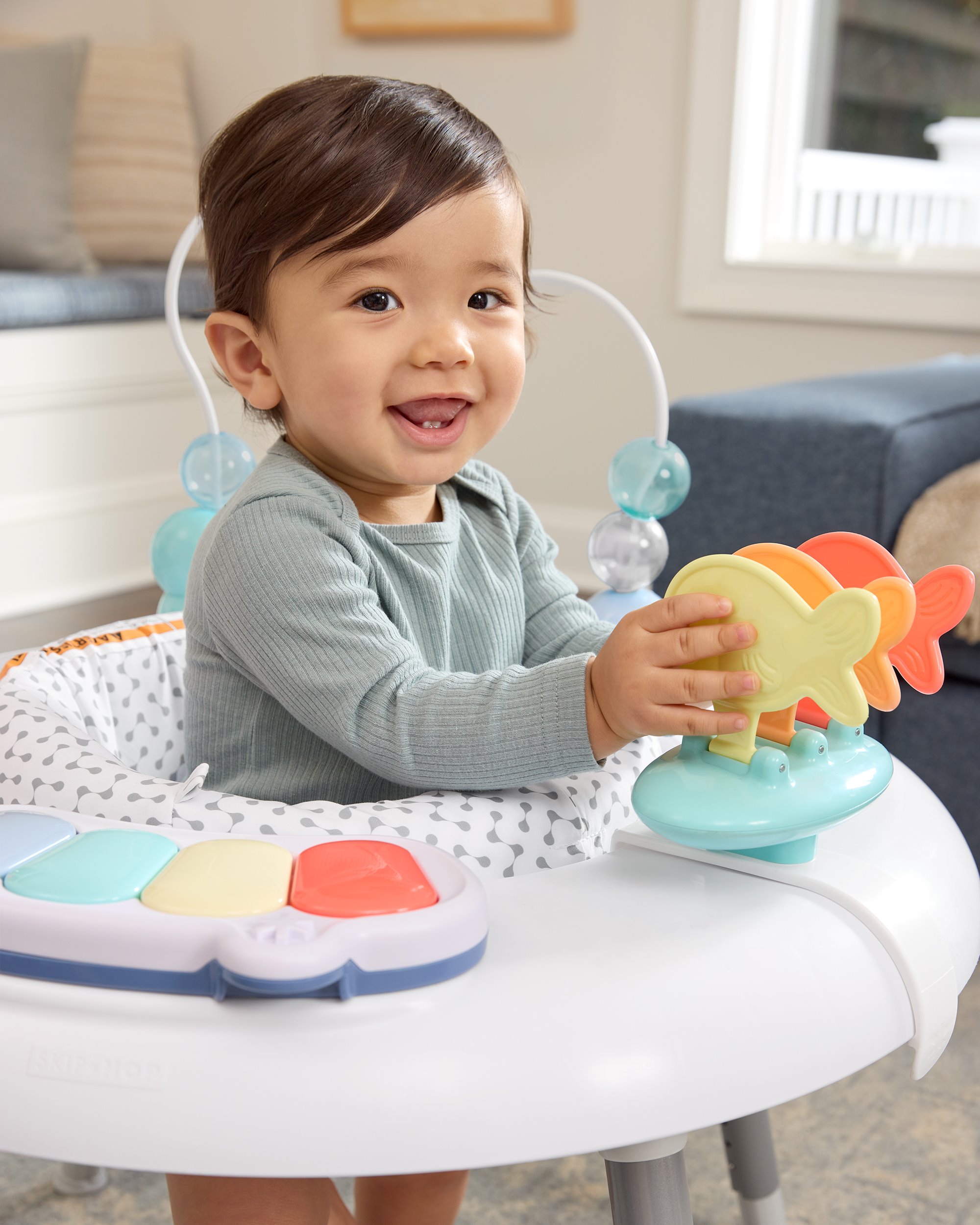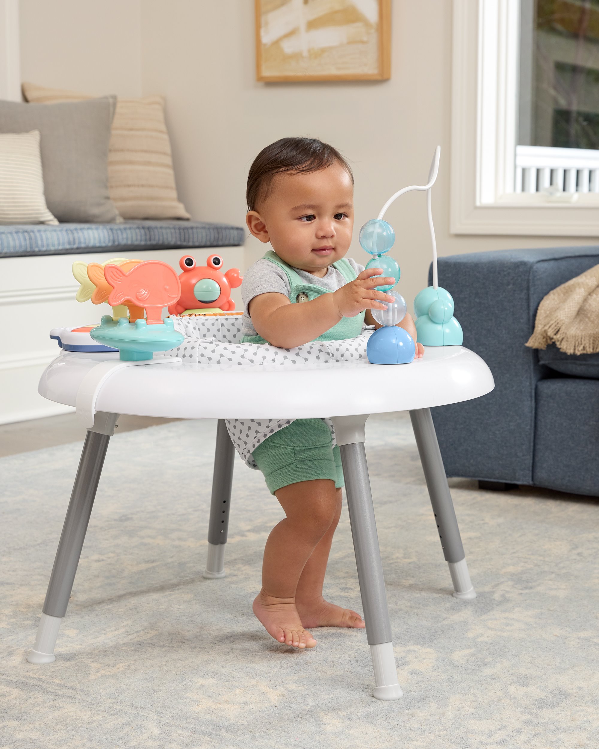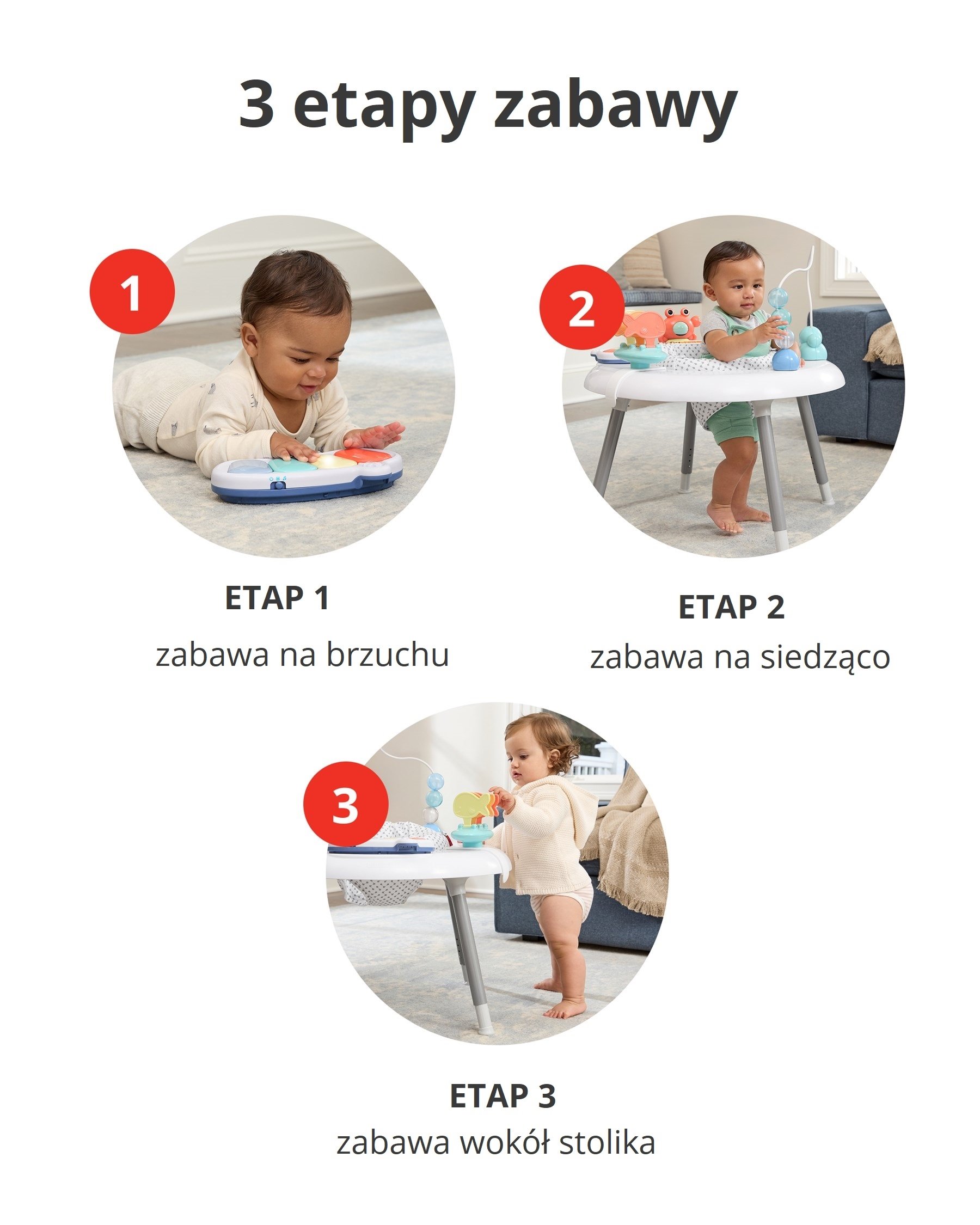 Interaktywne centrum aktywności dla niemowląt inspirowane podwodnym światem rośnie razem z dzieckiem i oferuje 2 etapy zabawy. W pierwszym etapie maluch siedzi w obrotowym 360° siedzisku, odkrywając kolorowe zabawki, dźwięki i świecące pianinko muzyczne. W drugim etapie centrum zmienia się w przestrzeń do nauki poruszania się i eksplorowania.