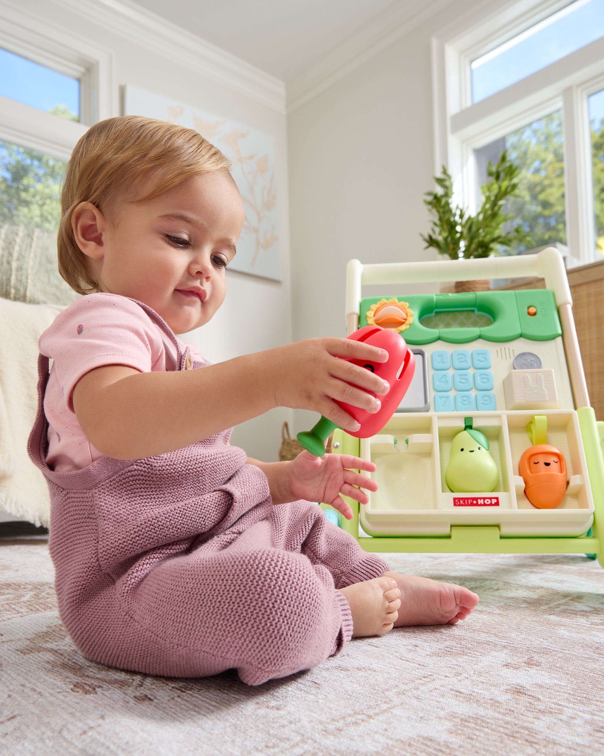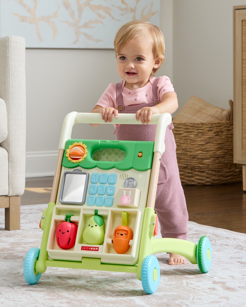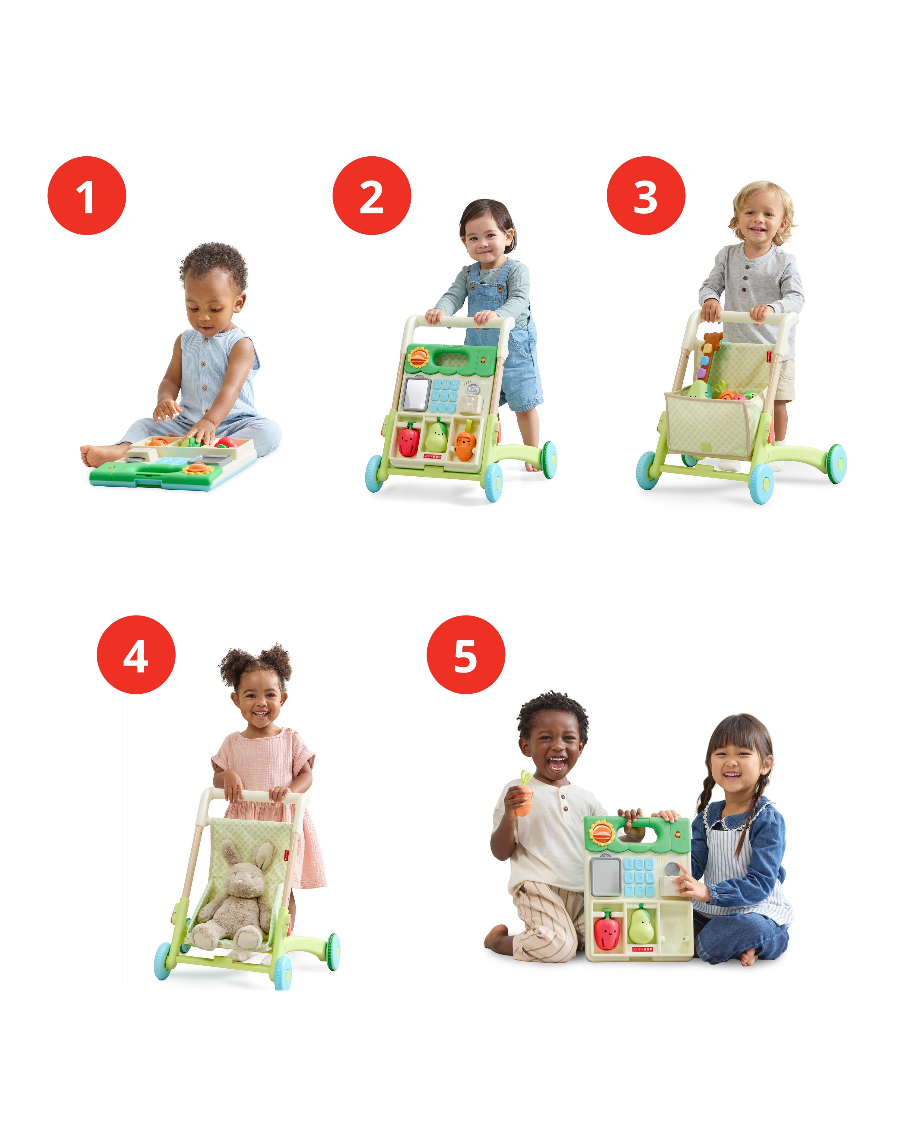 Interaktywny chodzik dla dziecka 5 w 1 z kolekcji Farmstand rośnie razem z maluchem i oferuje aż 5 sposobów zabawy: na siedząco, jako pchacz do nauki chodzenia, wózek zakupowy, spacerówkę dla zabawek oraz zabawę w sklep. Dzięki ponad 50 funkcjom – piosenkom, dźwiękom i światełkom zabawka angażuje dziecko i wspiera jego rozwój na wielu etapach.