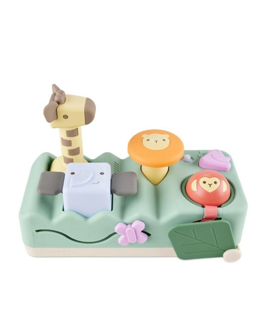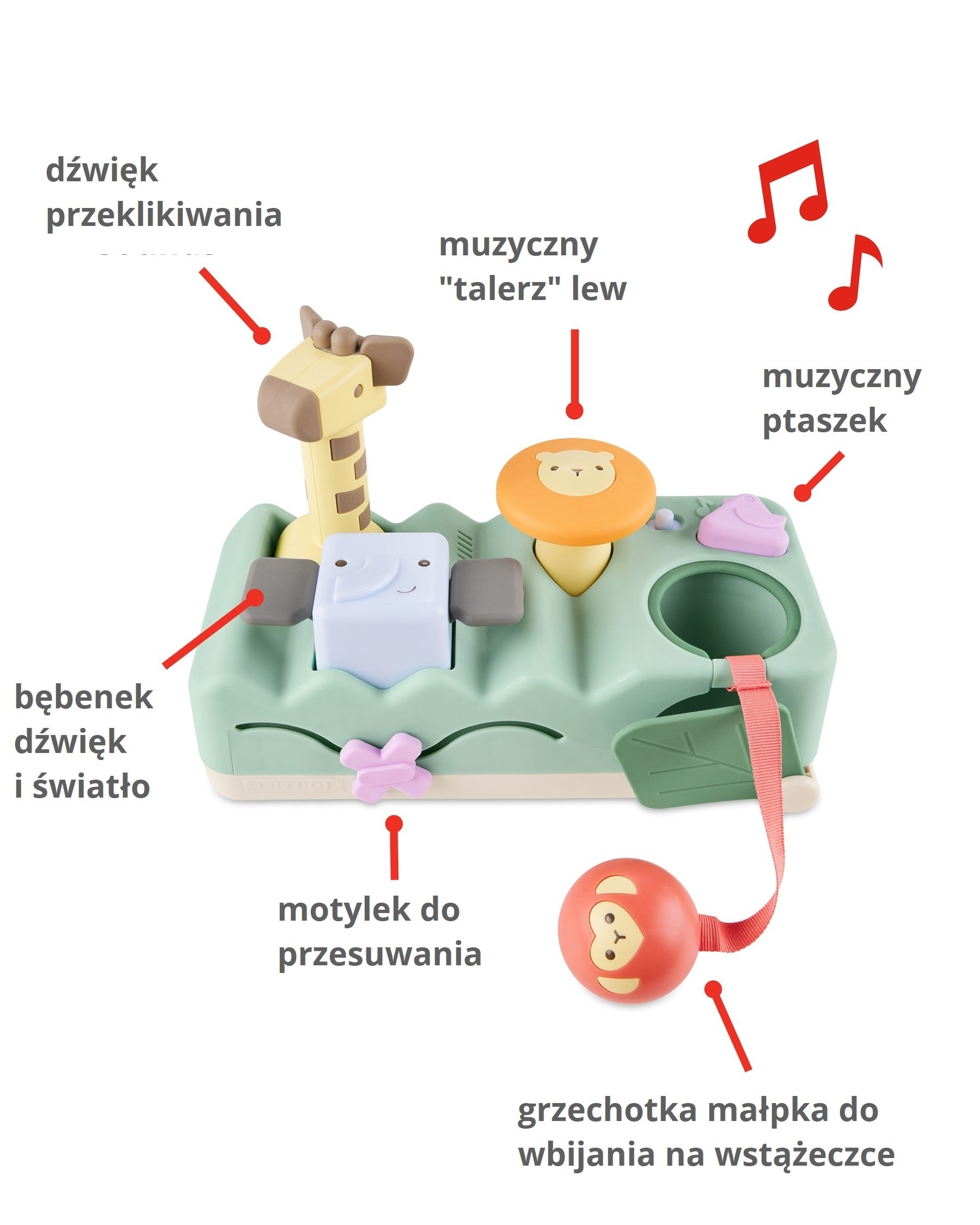 - zabawki edukacyjne: młoteczek w kształcie żyrafy z miękkimi uszami i nosem, podświetlany talerz w kształcie lwa, bęben bongo w kształcie słonia, muzyczny ptak, grzechotka-małpka, liść do zabawy w chowanego, suwak z motylem,