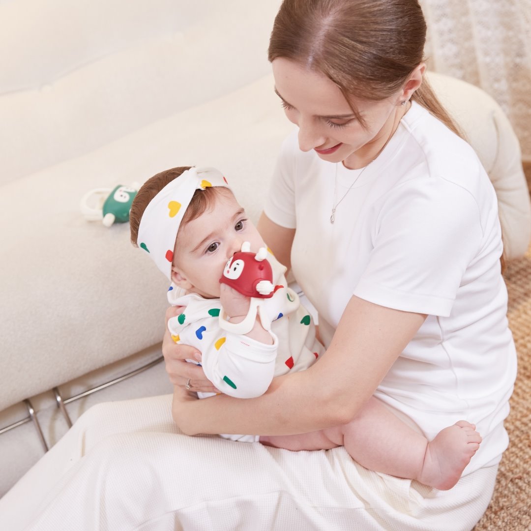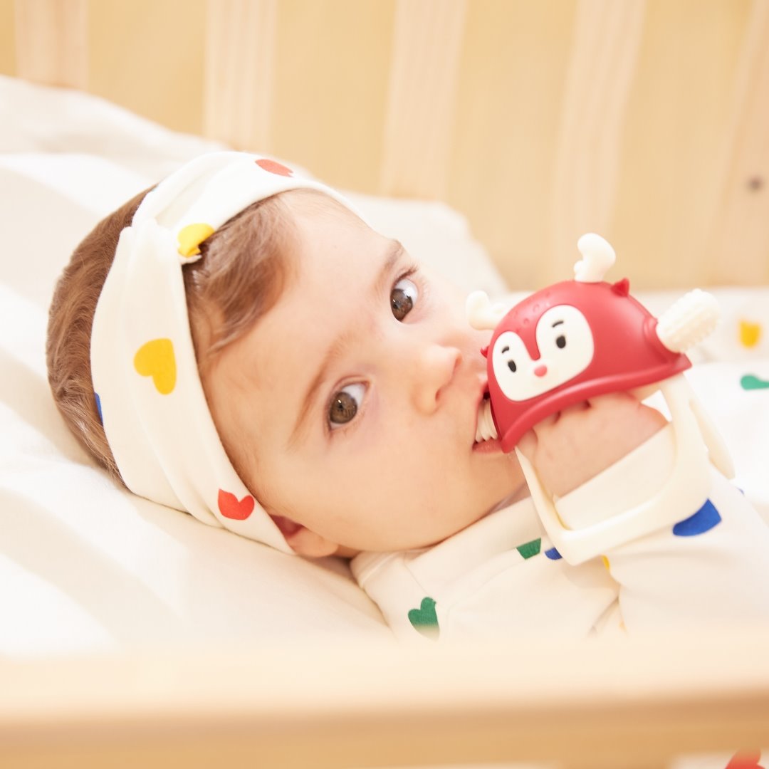Wykonany z przyjemnego, miękkiego i bezpiecznego silikonu spożywczego gryzak dla niemowlaka Renifer został zaprojektowany na kształt piersi i sutka mamy. Na jego wypustkach znajdują się różne tekstury stymulujące dziąsła dziecka i łagodzące ból związany z ząbkowaniem. Dodatkowo gryzak dla niemowlaka Smily Mia można chłodzić w zamrażarce, by wzmocnić jego kojące właściwości. To kolejny krok po gryzaku Pingwinie, którego wypustki były gładkie. Kiedy ból związany z ząbkowaniem nasila się, uspokajającego Pingwinka zamieniamy na masującego dziąsła Renifera.