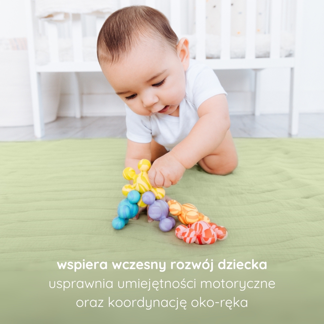 - kolorowy, przyciągający uwagę design – stymuluje rozwój wzroku,